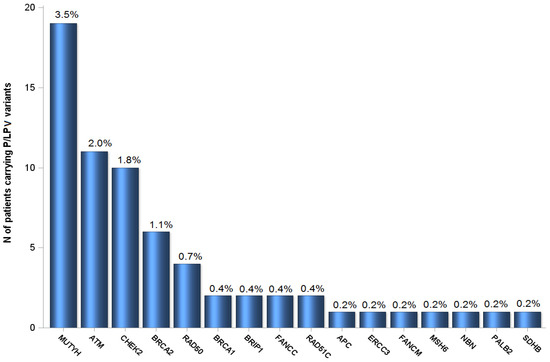 Prevalence of P/LPVs in 549 patients of the study. Single nucleotide variants (SNV), insertions/deletions (Indels) and copy number variant (CNV) detection was performed for the following genes: APC, ATM, BAP1, BARD1, BMPR1A, BRCA1, BRCA2, BRIP1, CDH1, CDK4, CDKN2A, (CDKN2Ap16(INK4A), CDKN2Ap14(ARF)), CHEK2, DDB2, DICER1, EPCAM, ERCC1, ERCC2, ERCC3, ERCC4, ERCC5, FANCA, FANCB, FANCC, FANCD2, FANCE, FANCF, FANCG, FANCI, FANCL, FANCM, GREM1, HOXB13, MEN1, MLH1, MRE11, MSH2, MSH6, MUTYH, NBN, PALB2, PMS2, POLD1, POLE, POLH, PTEN, RAD50, RAD51C, RAD51D, RB1, RET, SDHAF2, SDHB, SDHC, SDHD, SLX4, SMAD4, SMARCA4, STK11, TP53, VHL, XPA, XPC. Overall, 62 patients (11.3%) carried ≥1 P/LPV in at least 1 of 16 genes. Three patients carried two P/LPVs; two carried P/LPVs in CHEK2 and MUTYH and one in BRCA1 and MUTYH. The rest of the patients (59) had one P/LPV detected. The percentage of patients carrying a P/LPV in each gene is shown on top of each bar.