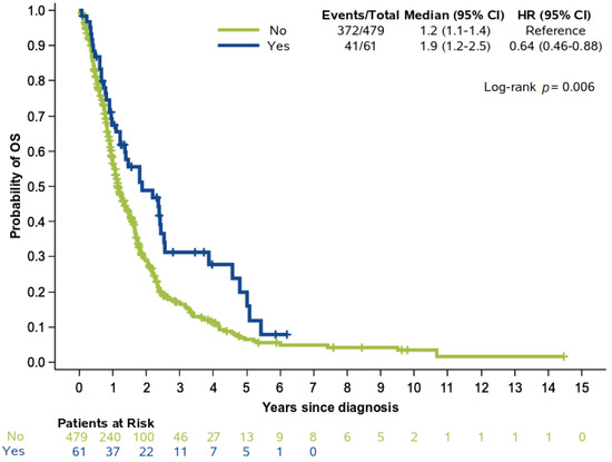 Within a median follow-up of 47.31 months (95% CI 34.75−64.10), a total of 413 (76.5%) deaths were reported. The median OS for the entire population with available survival data (N = 540) was 14.52 months (95% CI 13.08−16.52). Patients with P/LPVs had improved OS compared to non-carriers (22.62 months (95%CI 14.69−30.49) vs. 13.90 months (95% CI 12.82−16.23), log-rank p = 0.006) (Figure 2). The favorable prognostic significance of P/LPVs with respect to OS was underlined in the group of patients with early-stage disease (HR 0.47, 95% CI 0.26−0.84, p = 0.011), while significance was not reached among patients with advanced stage pancreatic cancer (HR 0.91, 95% CI 0.61−1.34, p = 0.62) even though the direction of the hazard ratio was retained. Upon multivariate analysis, there was only a trend for improved OS in P/LPV carriers (Wald’s overall p = 0.063) observed in the group of patients who had not received platinum-based chemotherapy (HR 0.65, 95% CI 0.43−1.05), whereas no difference was detected among platinum-treated patients (HR 0.77, 95% CI 0.47−1.23) (Table 2). The interaction term between the presence of P/LPVs and platinum treatment did not show a significant predictive benefit in the multivariate model (interaction p = 0.60), while, as expected, early stage contributed to significantly longer OS as compared to advanced stage of disease (HR 0.37, 95% CI 0.29−0.46, p < 0.001). The therapeutic effect of platinum exposure was also significant overall in the multivariate analysis (p = 0.002).