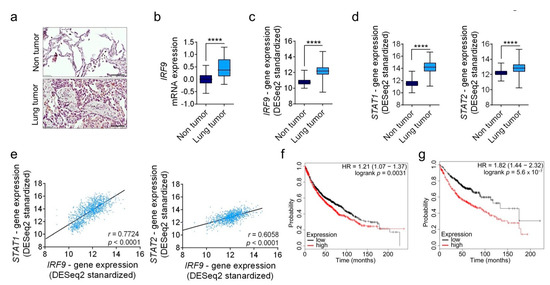 IRF9 expression is upregulated in patients with lung cancer and is associated with decreased survival. (a) Representative images of human lung sections stained with IRF9 antibody in LUAD (n = 14) versus healthy tissues (n = 3). Scale bar: 100 µm. (b) mRNA expression of IRF9 from LUAD and adjacent non-tumor tissues (n = 11). (c,d) Gene expression profiles of (c) IRF9, as well as (d) STAT1 and STAT2, in non-tumor tissues (n = 287) and patients with LUAD (n = 573) from the TCGA TARGET GTEx study. (e) Scatter plots of IRF9 expression correlated with STAT1 or STAT2 expression in 1122 lung tumor samples from a TCGA dataset. The r value and two-tailed p value were calculated using Pearson’s rank correlation coefficients. (f,g) Kaplan–Meier curves for IRF9 expression associated with the survival of patients with (f) lung cancer (n = 1926) and (g) LUAD (n = 720) patients, divided by the median into high and low expression. Data are expressed as means ± standard error of the mean. Analysis was performed using Student’s t-test: **** p < 0.0001, LUAD compared to non-tumor tissues.