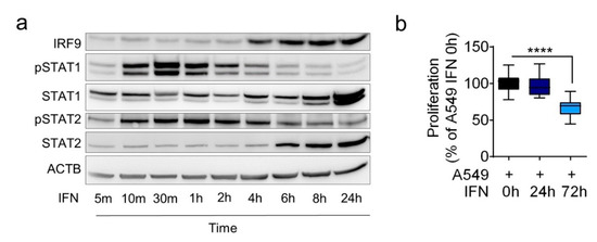 The transcription factor complex ISGF-3 was activated following IFN stimulation; hence, we stimulated A549 cells with type I IFN for several periods to visualize the temporal sequence. In Western blot analysis, STAT1 and STAT2 were phosphorylated at an early time point (strongest approximately 30–60 min), whereas the overall increase in the protein levels of IRF9, STAT1, and STAT2 occurred after several hours when phosphorylation was generally diminished (Figure 2a). Notably, the antiproliferative effect of IFN was not observed after 24 h of stimulation but rather after 72 h (Figure 2b). Additionally, the upregulation of IRF9 mRNA expression with a strong nuclear translocation in A549 cells was observed (Figure S2a–c).