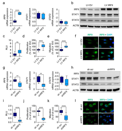 In further analysis, we used a lentiviral approach to stably transduce cells with an overexpression vector (LV IRF9) or a knockdown shRNA vector (shIRF9) together with respective control plasmids (LV EV; sh scr) in the LUAD cell lines A549 and A427. We confirmed the expression of IRF9, STAT1, and STAT2 in A549 cells at the mRNA (Figure 3a,g) and protein (Figure 3b,h) levels. Importantly, IRF9 knockdown in A549 cells led to decreased expression of STAT1 and STAT2 (Figure 3g), whereas its overexpression did not increase STAT1 and STAT 2 expression (Figure 3a).