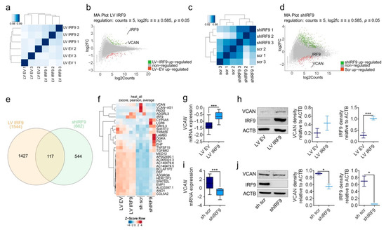 Following manipulation of IRF9, VCAN and IRF9 expression were correlated in LUAD cells. RNA-seq of transduced A549 cells was performed: A549 LV IRF9 cells were compared with A549 LV EV and A549 shIRF9 with A549 sh scr cells, respectively. (a,c), For correlations of RNA samples, only significantly regulated genes (p < 0.05) were selected for further analysis. (b,d) MA plots of upregulated and downregulated genes from each set (p < 0.05), with IRF9 and VCAN highlighted. (e) Venn diagram of A549 LV IRF9 cells and shIRF9 regulated genes. (f) Heatmap of the top 30 genes significantly regulated in both gene sets in opposite directions. VCAN was selected as a potential target of IRF9, and its expression was evaluated at (g,i) the mRNA and (h,j) protein expression levels, with quantification in IRF9-overexpressing and -silenced cells (n = 6). Data are expressed as means ± standard error of the mean. Analysis was performed using one-way analysis of variance with Welch’s t-test: * p < 0.05; *** p < 0.001.