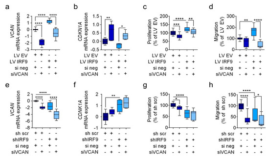 To ascertain whether VCAN regulation is responsible for the oncogenic behavior of IRF9, we used siRNA to knockdown VCAN in the IRF9 transduced cells (i.e., A549 and A427 cells). We successfully confirmed VCAN knockdown at the mRNA level in LV IRF9 and shIRF9 (Figure 6a,e). Following VCAN siRNA knockdown, we observed a reduction in the proliferation and migration of A549 LV IRF9 caused by IRF9 overexpression (Figure 6c,d). Moreover, using IRF9-silenced A549 cells, the transfection of siRNA against VCAN further reduced VCAN expression (Figure 6e) as well as proliferation and migration abilities (Figure 6g,h). Additionally, there was an increase in CDKN1A expression (Figure 6b,f), which suggests that proliferation and migration may be further regulated in a potential IRF9-VCAN-CDKN1A axis. Further, we screened mRNA expression of genes involved in the EGF pathway, cell cycle, and apoptosis, such as TP53, CDKN1B, CLDN1, EGFR, CDK4, CDK6, CCNB1, BCL2, BAD, BIK, and CASP3 in A549 cells transfected with siVCAN in the presence of IRF9 overexpression (LV IRF9) or knockdown (sh IRF9). Unfortunately, we could not detect any changes in the expression of TP53, CDKN1B, CLDN1, EGFR, CDK4, CDK6, CCNB1, BCL2, BAD, BIK, and CASP3 (Figure S7a–d).