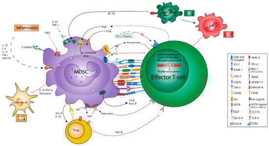 Recent reports indicate that the interaction of Treg with MDSC might further contribute to the immunosuppressive activity and potential of Treg, forming a positive feedback loop that facilitates the enforcement of their suppressive activity [130], as described in the following.