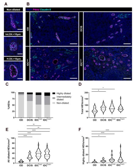 HEVs were divided into highly dilated (lumen diameter >10 µm), intermediately dilated (lumen diameter <10 µm) and non-dilated (closed lumen) (Figure 1A). Figure 1C summarizes the fraction of vessels (non-dilated, intermediately dilated and highly dilated) across all HEVs in each patient group, with an average of 10% total dilated HEVs in OD and 34% in DCIS to be compared with 48% in IDCmet− and 49% in IDCmet+. Quantification of the number of analyzed vessels per mm2 paracortical area showed that total HEV numbers were slightly increased in patients with DCIS and IDCmet− compared with ODs, but with no significant differences between patients with non-invasive and invasive cancer (Figure 1D). However, major differences were observed when evaluating the presence of dilated HEVs (Figure 1E,F). While there was an increase in total number of dilated vessels in all BC patients compared to cancer-free ODs, there was a significant increase in dilated vessels in patients with IDC, also when compared with LNs from patients with DCIS (Figure 1E). No significant difference was seen in IDC patients without (IDCmet−) compared to with LN metastasis (IDCmet+) (Figure 1E). Also highly dilated vessels showed the strongest increase in patients with IDC, with no significant differences in patients with and without nodal metastasis (Figure 1F).