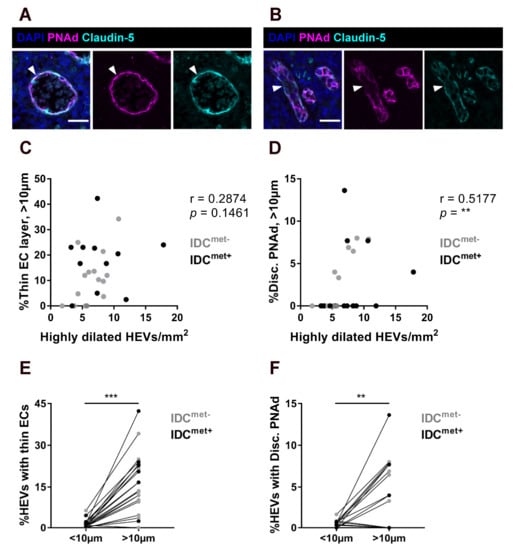 Thinning of the endothelium and discontinuous PNAd-expression in highly dilated HEVs. (A) Example image of an HEV (PNAd+/Claudin-5+) with thin endothelial cell (EC) layer. Arrowhead outlines thin endothelium. Scale bar: 25 µm. (B) Example image of an HEV with discontinuous PNAd expression. Arrowhead outlines part of the endothelium (Claudin-5+) with loss of PNAd (PNAd-). Scale bar: 25 µm (C) Correlation analysis of the percentage of highly dilated HEVs with thin EC layer out of all highly dilated HEVs, and the total number of highly dilated HEVs (HEVs/mm2) (D) Correlation analysis of the percentage of highly dilated HEVs with discontinuous PNAd expression out of all highly dilated HEVs, and the total number of highly dilated HEVs (HEVs/mm2). (C,D) n = 16 IDCmet− LNs from 16 patients without LN metastasis (light grey dots) and n = 11 IDCmet+ LNs from 10 patients with LN metastasis (black dots). (E) Paired analysis of the frequency of thin ECs in highly dilated HEVs (>10 µm) versus HEVs with less than 10 µm dilation; n = 12 IDCmet− LNs from 12 patients (light grey dots) and n = 9 IDCmet+ LNs from 8 patients (black dots). (F) Paired analysis of the frequency of loss of PNAd in highly dilated HEVs (>10 µm) versus HEVs with less than 10 µm dilation; n = 12 IDCmet− LNs from 12 patients (light grey dots) and n = 6 IDCmet+ LNs from 5 patients (black dots). Spearman correlation test was used for correlation analysis and Paired t-test and Wilcoxon matched-pairs signed rank test were used for paired analysis. ** p < 0.01, *** p < 0.001.