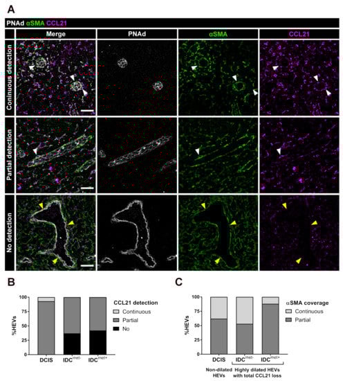 Paracortical HEVs of DCIS (non-dilated) and IDCmet− and IDCmet+ (highly dilated) were selected for analysis (n = 5 patients per group, n = 19 ± 2 analyzed HEVs per patient). CCL21 was categorized as continuous, partial, or no detection. To determine the presence of perivascular αSMA+ cells lining vessels with different CCL21-status, HEVs with continuous or partial CCL21 were selected from DCIS and HEVs with no detection were selected from IDCmet− and IDCmet+. The vessels were categorized as having continuous, partial, or no coverage with αSMA+ cells.