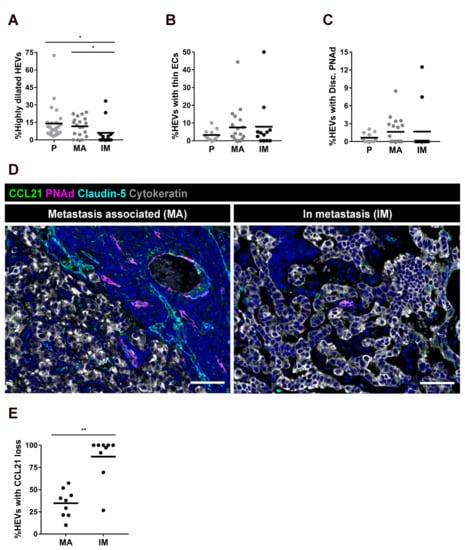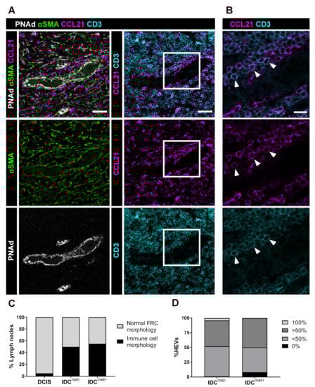 The following are available online at https://www.mdpi.com/2072-6694/13/2/211/s1, Figure S1: Method for image analysis.; Figure S2: Similar degree of HEV dilation in non-metastatic sentinel and axillary LNs draining IDC.; Figure S3: Loss of CCL21 in highly dilated HEVs; Figure S4: αSMA staining of MA-HEVs and IM-HEVs. Figure S5: Correlation analysis of metastatic burden and paracortical remodeling of HEVs; Figure S6: CCL21 is confined to HEV-lining FRCs around non-dilated HEVs; Figure S7: Image analysis of CCL21 and CD3 in DCIS and IDC; Figure S8: Loss of HS in highly dilated HEVs; Table S1: Clinical data of the patient cohort; Table S2: Primary antibodies; Table S3: Secondary antibodies.