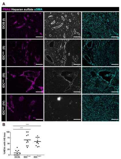 Heparan sulfate (HS) expression in perivascular αSMA+ cells was analyzed in non-dilated paracortical HEVs in LNs with reticular CCL21 morphology from DCIS patients (n = 11 LNs from 11 patients, n = 11 ± 4 HEVs per patient) and highly dilated paracortical HEVs from IDCmet− (n = 10 LNs from 10 patients, n = 16 ± 14 HEVs per patient) and IDCmet+ (n = 11 LNs from 11 patients, n = 28 ± 13 HEVs per patient) with immune cell CCL21 morphology. The vessels were categorized as having continuous HS-expression or full or partial loss of HS lining the vessel perimeter.