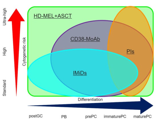 - Paiva, B.; Puig, N.; Cedena, M.T.; de Jong, B.G.; Ruiz, Y.; Rapado, I.; Martinez-Lopez, J.; Cordon, L.; Alignani, D.; Delgado, J.A.; et al. Differentiation stage of myeloma plasma cells: Biological and clinical significance. Leukemia 2017, 31, 382–392. [Google Scholar] [CrossRef] [PubMed]