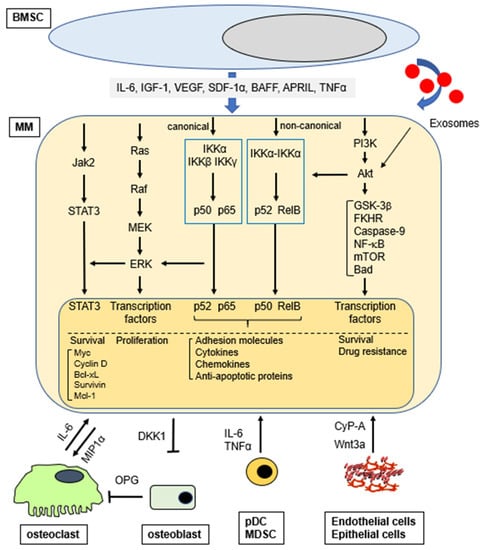 The BM microenvironment consists of different cell types that produce and secrete numerous soluble factors and physically interact with MM cells. Importantly, soluble activating factors are further upregulated by MM cell adhesion with these cells [1,2,11,15,16,17,18,19,20,21,22,23,24,25,26,27,28,29,30]. These cytokines activated signaling pathways include: extracellular signal related kinase (ERK, also known as p42/44 mitogen activated protein kinase); Janus kinase (JAK)2/signal transducers and activators of transcription (STAT)3; phosphoinositide 3-kinases (PI3K)/Akt (also known as protein kinase B); nuclear factor κ-B (NF-κB); transforming growth factor (TGF)-β/Smad and Wnt/β-catenin (Table 1).