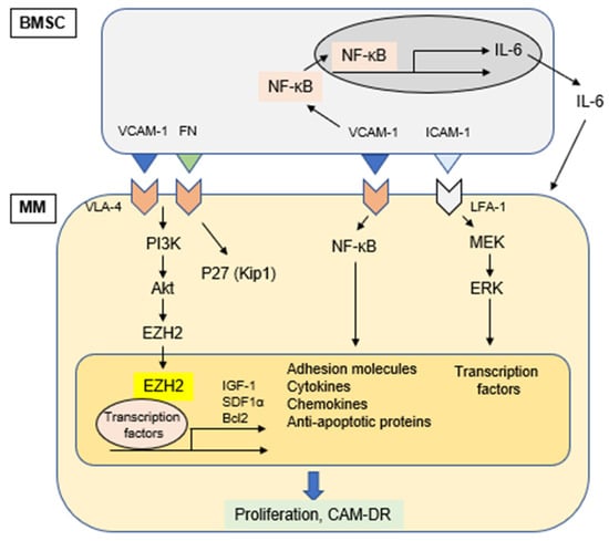 CXCL12 (also known as SDF1α) is indispensable for homeostatic processes such as lymphopoiesis and embryogenesis. CXCL12 is constitutively produced by BMSCs [128]. We have shown that CXCL12 induces phosphorylation of ERK and Akt, as well as NF-κB, thereby promoting tumor cell growth, survival, and migration. It also protects MM cells from dexamethasone-induced apoptosis [23]. A recent study has also shown that CXCL12 is a relevant target to attenuate CAM-DR in MM [129]. Alterations in chromatin modifications, such as histone methylation, mediate chemotherapy resistance in several cancer types. Kikuchi et al. demonstrated that pharmacological and genetic inhibition of the IGF1R-PI3K-AKT pathway reverses CAM-DR by promoting enhancer of zeste homolog 2 (EZH2) dephosphorylation and H3K27 hypermethylation both in vitro and in refractory murine MM models, suggesting an epigenetic mechanism underlying CAM-DR [130].