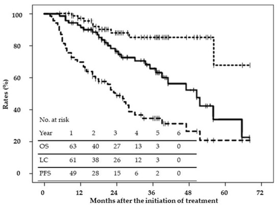 Curves for overall survival (OS) (solid line), local control (LC) (dotted line), and progression-free survival (PFS) (dashed line) for all patients.