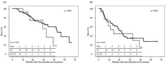 (A) OS and (B) PFS according to TNM stage. Solid line, T1; dotted line, T2–T3.