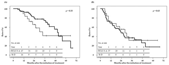 (A) OS and (B) PFS according to BCLC stage. Solid line, BCLC 0–A; dotted line, B–D.