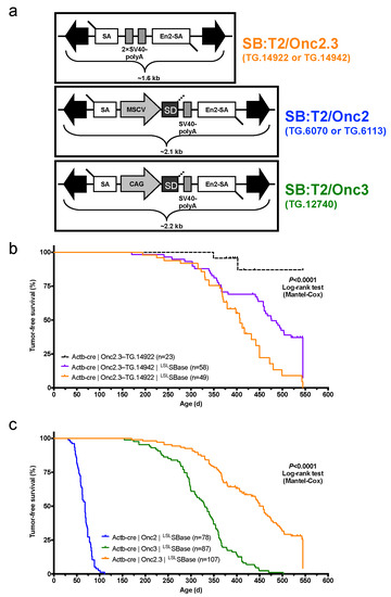 - Mann, M.B.; Mann, K.M. SB-Onc2.3 multiplex PCR genotyping protocol. Figshare 2020. Available online: https://doi.org/10.6084/m9.figshare.12811301 (accessed on 30 September 2020).