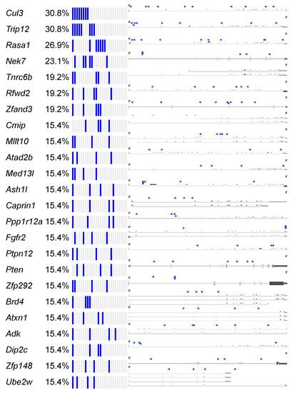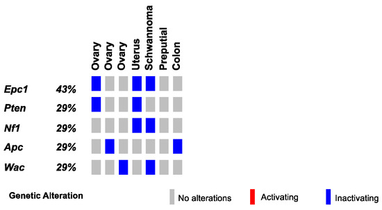 - Rangel, R.; Lee, S.C.; Hon-Kim Ban, K.; Guzman-Rojas, L.; Mann, M.B.; Newberg, J.Y.; Kodama, T.; McNoe, L.A.; Selvanesan, L.; Ward, J.M.; et al. Transposon mutagenesis identifies genes that cooperate with mutant Pten in breast cancer progression. Proc. Natl. Acad. Sci. USA 2016, 113, E7749–E7758. [Google Scholar] [CrossRef] [PubMed]