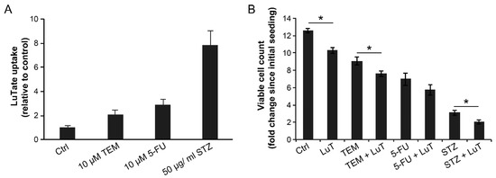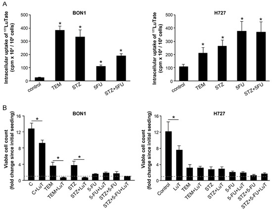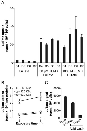 2.3. Sequential Treatment of TEM and LuTate Also Increases Intracellular Uptake of LuTate in BON-1 Cells