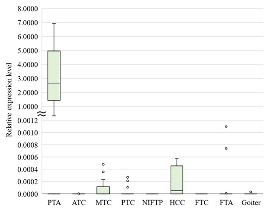GCM2 mRNA expression in parathyroid and thyroid tumors and goiters, presenting the median value, upper and lower quartiles, a nonoutlier range, and outliers (circles). PTA, parathyroid adenoma; ATC, anaplastic thyroid carcinoma; MTC, medullary thyroid carcinoma; PTC, papillary thyroid carcinoma; NIFTP, noninvasive follicular thyroid neoplasm with papillary-like nuclear features; HCC, Hürthle cell carcinoma; FTC, follicular thyroid carcinoma; FTA, follicular thyroid adenoma.
