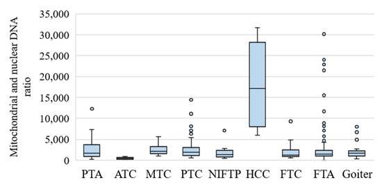 HCC (and HCA) is categorized by the WHO as a special type of tumor, among other reasons, owing to differences from FTC in the molecular profile and clinical behavior [41,42]. Our results imply that HCC may derive from FTC because mtDNA/nDNA values for FTC are on a continuum with the results for HCC (except for one sample that was identified as benign by our classifier). In other words, there were no outliers in the FTC group because they all fell into the HCC group (Figure 4). For other types of tumors, there were some outliers that corresponded to Hürthle cell subtypes of these tumors. For instance, for nine cases of FTA, the histological diagnosis indicated that they were Hürthle cell subtypes, and among them, in eight cases (88.9%), the mtDNA/nDNA ratio exceeded the cutoff specified in our classifier.