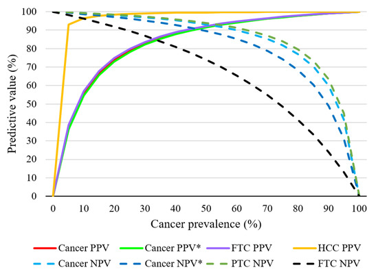 In a real-world patient population, the presence of NIFTP cases should not much affect PPV and NPV because although sensitivity and specificity characterize a test independently of the incidence of cancer (in this case, in the study population), but NPV and PPV depend on the incidence. Assuming fixed sensitivity and specificity, Bayes’ theorem can predict the dependence of a test’s NPV and PPV on the incidence of cancer, and even in the general population [47]. These dependences are illustrated in Figure 6; the curves of functions are not shown in Figure 6 if specificity or sensitivity was 100% (e.g., for our MTC cases).