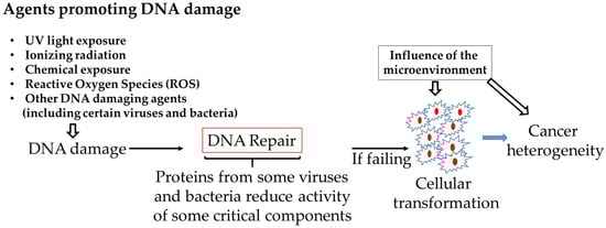 A large amount of DNA damage occurs per cell every day due to numerous causes, including viral and bacterial infections. The majority of them are repaired, but the repair processes are not very efficient due to interferences of the bacterial and viral proteins with the host cellular machineries. Unrepaired damage increases mutations, activating oncogenes or inactivating tumor suppressor genes that ultimately cause genomic instability thereby increasing the risk of cancer. By interfering with pathways responsible for DNA repair, resulting in accumulation of mutations and a consequent greatly increased chance of cellular transformation, the proteins of certain viruses or bacteria would thus similarly contribute to cellular transformation. The tumor microenvironment could then affect tumor cell growth [] (Figure 1). Our review provides a framework to better understanding the common role played by some viruses and bacterial proteins in disrupting the role of cellular proteins implicated in DNA damage and repair, eventually leading to cellular transformation. This knowledge would also have implications for the prevention and treatment of cancer.