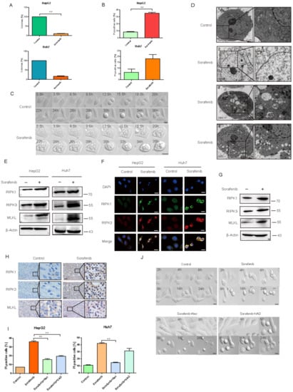Figure 1C,D showed the morphological changes in HepG2 cells by Live Cell Imaging System and a Transmission Electron Microscope. We can see that cells experienced normal mitotic proliferation in the control group. While in the Sorafenib treated group, cells suffered a blocked proliferation, cellular content aggregates, and eventually swelled until dead (Figure 1C). More accurate views of various changes in cell death patterns were investigated by a Transmission Electron Microscope. As shown in Figure 1D, the healthy state of liver cancer cells was presented in the control group. Picture No. 1 showed the complete organelles like mitochondria and it has complete cell membrane structures. However, Sorafenib induced cell death, including necroptosis, apoptosis, and autophagic death, etc. In Picture No. 2, cell membrane and organelles that were destroyed are shown in the Sorafenib treated group. Cells swelled, cell content was released, and the morphology of the main cell main presented as necrosis. We also observed an apoptotic body in Picture No. 3 and autophagosomes in Picture No. 4. In Figure 1E,F, the expression of necroptosis marker proteins such as RIPK1, RIPK3, and MLKL were detected by western blot and immunofluorescence. The results showed that RIPK1, RIPK3, and MLKL were increased in treated cells, which strongly suggested that Sorafenib activated the necroptosis pathway. Additionally, the necroptosis marker proteins were detected in tumor tissues in the PDX model. WB (Figure 1G) and IHC (Figure 1H) results showed that Sorafenib induced necroptosis in vivo as well. Besides, the HepG2 cells xenograft model was used to confirm the results (Figure S3A,B). All the results indicated that Sorafenib induced HCC necroptosis in vitro and in vivo.