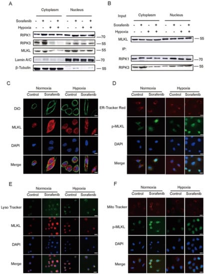 The necroptosis key protein MLKL usually acts on lipid and cell membrane structures, causing membrane damage and eventually leading to cell death [,]. In order to figure out the mechanisms of Sorafenib resistance under hypoxia, the changes in MLKL expression and the complex of RIPK1/RIPK3/MLKL in cytoplasm were studied. In Figure 3A, under normoxia, RIPK1, RIPK3, and MLKL were increased by Sorafenib in cytoplasm. However, under hypoxia, necroptosis related proteins were down-regulated in cytoplasm. The RIPK1/RIPK3/MLKL complex was also detected by Co-IP (Figure 3B). Results showed that, in cytoplasma, Sorafenib increased the RIPK1/RIPK3/MLKL complex under normoxia and had no obvious effect under hypoxia. Therefore, Sorafenib could not increase necrosome in cytoplasm, which might be an important reason for Sorafenib resistance under hypoxia.