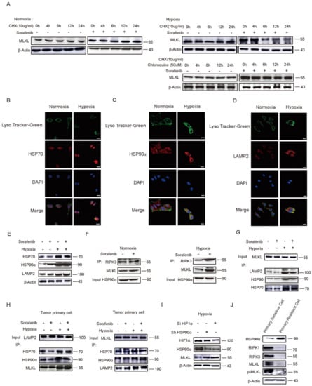 Chaperone-mediated autophagy (CMA) is a lysosomal pathway of proteolysis that is responsible for the degradation of 30% of cytosolic proteins [,]. HSP70 and HSP90 is the most essential component for protein transport across the lysosomal membrane in process of CMA [,]. They cannot only locate the substrate protein, but also recognize substrate protein. HSP90α can also be formed a polymer structure on the membrane of lysosome cavity side to maintain the stability of the transport complex. LAMP2/HSP70/HSP90α complex is the marker and finally identified as the lysosomal membrane receptor of CMA pathway to combine and transport substrate proteins. In Figure 4B–D, we observed lysosomes with lyso-tracker and detected the expression of HSP70, LAMP2, and HSP90α by immunofluorescence. Notably, compared normoxia, HSP70, LAMP2, and HSP90α, they were strikingly increased under hypoxia and were located in lysosomes. Similarly, WB results indicated that HSP70, LAMP2, and HSP90α were high expressed under hypoxia (Figure 4E). Furthermore, the capacity of HSP90α binding with RIPK3 and MLKL was much more in hypoxia than that in normoxia (Figure 4F). The HSP70/HSP90α/LAMP2/MLKL complex was also detected by Co-IP. We tested the capacity of MLKL binding with HSP70/HSP90α/LAMP2 being increased obviously under hypoxia conditions in HepG2 cells (Figure 4G). Similar results were found in primary tumor cells (Figure 4H). Besides, the capacity of LAMP2 binding with HSP70/HSP90α/MLKL was increased in hypoxia. LAMP2 and HSP90α were also highly expressed in the tumor internal hypoxia area compared to the normoxia tumor area in vivo; however, the expression of MLKL was decreased in hypoxia (Figure S2F). Collectively, MLKL, as a customer, was recognized by the HSP70/HSP90α/LAMP2 transporter and was transported into lysosome, and then degraded in the end; all these results suggested that MLKL could be degraded under hypoxia through the chaperone-mediated autophagy (CMA) degradation pathway.