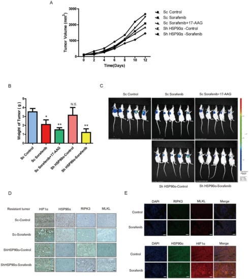 HSP90α can be a Useful Target in Sorafenib Resistance Therapy In Vivo. (A) Tumor volume was recorded in primary Sorafenib resistant xenograft model. (B) Tumor weight was recorded in primary Sorafenib resistant xenograft model. The results were shown as mean ± SEM from three independent experiments. * p < 0.05, ** p < 0.01, ns, not significant. (C) Bioluminescence images of the primary Sorafenib resistant xenograft model. (D,E) The expression of HIF1α, HSP90α and necroptosis pathway in tumors detected by IF and IHC. Scale bar = 800 μm.