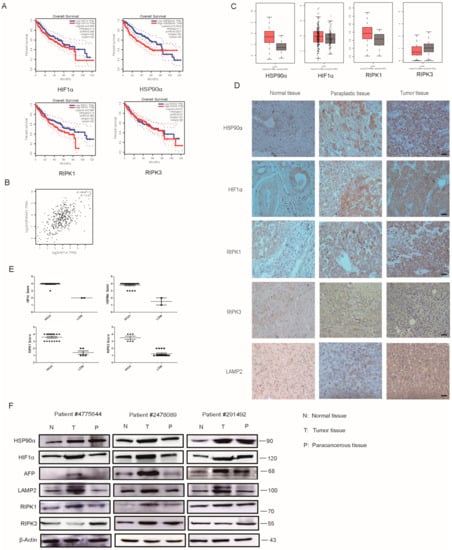 Clinical Analysis of HIF1α/HSP90α as a Therapeutic Target. (A,B) The overall survival and correlation of several proteins in GEPIA (Gene Expression Profiling Interactive Analysis) database. (C) Expressions of HSP90α, HIF-1α, RIPK1 and RIPK3 in GEPIA (Gene Expression Profiling Interactive Analysis) database. (D) Protein expressions in tumor, para-carcinoma, and normal tissues of patient samples detected by IHC. Scale bar = 500 μm. (E) Analysis the expressions of HSP90α, HIF-1α, RIPK1 and RIPK3 in patient samples. (F) Protein expressions in tumor, para-carcinoma, and the normal tissues of patient samples detected by WB.