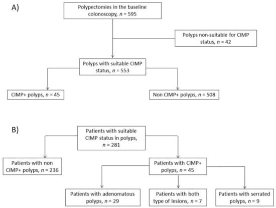 For comparative analyses, patients were classified according to their CIMP status at baseline colonoscopy. Additional analyses compared patients with adenomas or serrated lesions; these analyses excluded patients having both types of lesions. The chi-square test was used to compare these groups according to sex, presence of genetic alterations in the polyps, previous CRC, previous smoking, and other baseline categorical features. Variables with more than three categories were analyzed using an ANOVA test. Baseline age, polyp size, polyp number, and other quantitative variables were compared using the Student’s t-test, after applying Levene’s test for parametric variables, or the Mann–Whitney U test for non-parametric variables. We also used the same methods to compare polyps from the baseline colonoscopy in terms of several variables, according to CIMP status.