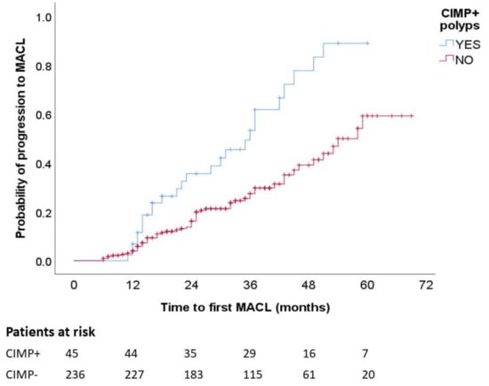 A separate analysis of patients with adenomatous and serrated polyps also revealed shorter intervals to MACL diagnosis in patients with CIMP+ adenomas (p log-rank, 0.009) (Figure S1A) and in patients with CIMP+ serrated polyps (p log-rank, 0.042) (Figure S1B). In the multivariate analysis including patients with adenomatous polyps, higher risk of MACL development was associated with CIMP+ status (HR, 2.78; 95% CI, 1.19–6.47) and the presence of three or more polyps (HR, 3.83; 95% CI, 1.81–8.13) (p < 0.001 for both) (Table S2).