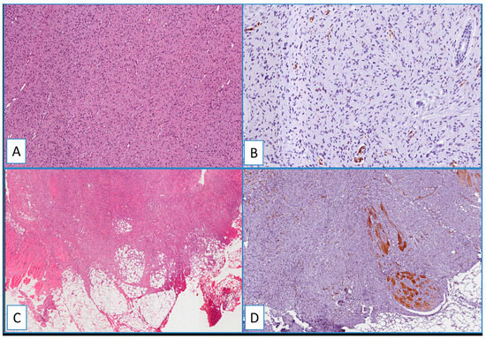 Dermatofibrosarcoma protuberans (DFSP) typically presents as a nodular subcutaneous mass with slow but persistent growth, often lasting several years. It is a relatively rare sarcoma, with an estimated prevalence of 1:10,000 and an incidence of about 1:200,000, generally occurring between the second and fifth decade of life. It typically occurs during adult life as a nodular mass of the skin. Although initially considered rare in children [1,2,3,4], an increasing number of cases have been reported even in childhood [2]. Males are more affected than females [2]. Although these tumors can occur in almost any location, they are most frequently found on the trunk and proximal extremities. Although it presents as a grossly well-circumscribed mass, this neoplasm usually infiltrates the dermis and subcutis. The tumor can reach the epidermis or spare an area of the dermis just below the epidermis (the grenz zone). The periphery of the tumor has a deceptively bland-looking appearance. This is particularly evident in the superficial areas, where the infiltration of the dermis by bland-looking cells can become a confounding factor in the differential diagnosis with dermatofibroma. In deeper regions, the tumor infiltrates along the connective septa and between the appendages and/or intertwines with lobules of subcutaneous adipose tissue, creating the characteristic “honeycomb” appearance. The central part of the tumor is composed of a uniform population of thin fibroblasts arranged into a predominant storiform growth pattern, with low vascularization. Mild nuclear atypia, low/moderate mitotic activity, as well as giant cells and inflammatory cells can be observed. Occasionally, DFSP may exhibit extensive myxoid stromal changes that can obscure the typical storiform growth pattern, closely mimicking a myxoid liposarcoma. Accordingly, the diagnosis of DFSP with abundant myxoid matrix usually requires the identification of typical areas, at least focally, within this context. There is increasing evidence that a small subgroup of DFSP contains areas indistinguishable from conventional fibrosarcoma (so-called “dermatofibrosarcoma, fibrosarcomatous variant”) and, more rarely, from undifferentiated pleomorphic sarcoma [5,6,7,8,9,10,11,12,13,14,15,16,17,18]. These areas, interpreted as a dedifferentiation tumor process, have a higher risk of local recurrence, while their metastatic potential is still debated. These tumors share the same general clinical features as normal DFSPs and, in most cases, fibrosarcomatous foci are already present in the primary tumor. Fibrosarcomatous foci of de-differentiation, which usually constitute up to 5–10% of the entire tumor, are characterized by “herringbone”—rather than storiform—or fasciculated architecture, being composed of spindle cells with moderate to focally severe nuclear atypia; mitotic activity is increased while immunoreactivity for CD34 is usually reduced when compared to the surrounding typical dermatofibrosarcoma areas. In addition, fibrosarcomatous areas are also characterized by a higher MIB-1 index and increased p53 positivity compared to the typical DFSP areas. Although a mitosis cut-off is not required to diagnose fibrosarcomatous de-differentiation, mitotic activity in these areas averages 7 to 15 mitosis/10 high power fields (HPF) compared to 1–3/10 HPF of traditional DFSP.