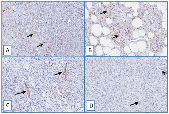 Immunohistochemical analyses showed no detectable staining for WT1 in dermatofibroma (A), spindle cell lipoma (B), nodular fasciitis (C), and solitary fibrous tumor (D). Cytoplasmic staining of blood vessels served as a positive internal control (arrows) (immunoperoxidase; original magnifications 50× (A,D) and 150× (B,C)).