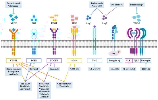 Although initially VEGF inhibitors were promising, it was soon seen that their clinical efficacy was limited and produced upregulation of other proangiogenic signals, toxicity, and other side effects [13,22]. For this reason, it was proposed that combining drugs that inhibit VEGF/VEGFR with drugs that block alternative pathways could avoid resistances and increase the effectiveness. Alternative pathways against which drugs have been tested with promising results include platelet-derived growth factor (PDGF), fibroblast growth factor (FGF), hepatocyte growth factor (HGF), angiopoietins, and transforming growth factor β (TGF-β) (Figure 1), among others.