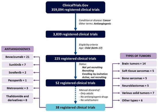 Research on new targets for the development of efficient antiangiogenic therapy and new clinical trials with larger numbers of patients are necessary. Currently, there are 38 clinical trials that use antiangiogenic drugs and include pediatric patients with solid tumors registered in ClinicalTrial.gov (Figure 2, Table S2), the largest database of clinical trials in the world. Most of them use bevacizumab combined with other therapeutical agents, but sunitinib, sorafenib, and pazopanib are also used. There are also pediatric clinical trials with metronomic therapy, thalidomide, or its derivatives. In relation with type of tumors, brain tumors are the most studied but it should be noted that there are seven clinical trials that include patients with very different types of cancer and whose interpretation can be difficult. It is also remarkable that many of these trials include not only pediatric patients.