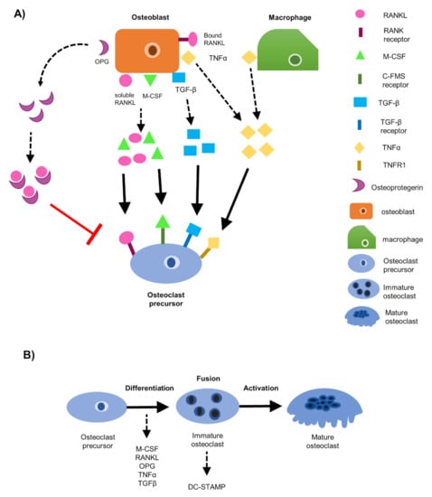 - Hattersley, G.; Owens, J.; Flanagan, A.; Chambers, T. Macrophage colony stimulating factor (M-CSF) is essential for osteoclast formation in vitro. Biochem. Biophys. Res. Commun. 1991, 177, 526–531. [Google Scholar] [CrossRef]