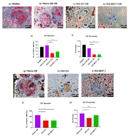 Since we found alterations in osteoclast formation upon exposure to EO CM, we wanted to determine how this affect may be modulated by direct cellular contact. Therefore, RAW 264.7 pre-osteoclasts were co-cultured with naïve osteoblasts (control) or EO cells (i.e., EO-231 or EO-MCF-7) (Figure 2g–i). All conditions were cultured in the presence of exogenous RANKL for six days and stained for TRAP to identify the number of TRAP-positive, multinucleated (≥3 nuclei) osteoclasts. We observed that osteoclasts produced in the presence of EO cells were smaller in size (Figure 2h,i,k) than osteoclasts produced in the presence of naïve osteoblasts (Figure 2g,k). Similar to results observed when osteoclasts were produced in the presence of EO CM, we found a 30% reduction in the number of TRAP-positive, multinucleated (≥3 nuclei) osteoclasts produced in the presence of EO-231 cells and a 19% reduction in the number of TRAP-positive, multinucleated (≥3 nuclei) osteoclasts produced in the presence of EO-MCF-7 cells when compared to the number of osteoclasts produced in the presence of naïve osteoblasts (Figure 2j). Osteoclasts produced in the presence of EO-231 cells had 33% smaller perimeters compared to those produced in the presence of naïve osteoblasts (Figure 2k). Although not significant, we found osteoclasts produced in the presence of EO-MCF-7 cells were 12% smaller than osteoclasts produced in the presence of naïve osteoblasts (Figure 2k). These results suggest that direct interaction between EO cells and osteoclast precursors reduce the number of TRAP-positive osteoclasts formed in-vitro.