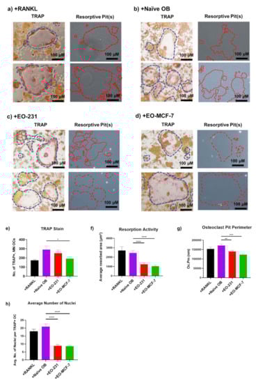 Osteoclasts produced in the presence of EO cells have decreased resorptive activity and reduced pit perimeter. RAW 264.7 pre-osteoclasts were co-cultured on a bone mimetic matrix with either (a) 50 ng/mL RANKL (control), or in the presence of 50 ng/mL RANKL under the following conditions: (b) naïve OBs (control), (c) EO-231, or (d) EO-MCF-7. After six days, cultures were stained for TRAP (pink color; blue outlines), a common marker for mature osteoclasts. Formation of resorptive pits were also observed (red outlines) and matched to the corresponding TRAP picture for each condition. Representative images are displayed per condition. The number (No.) of TRAP-positive, multinucleated (≥3 nuclei) mature osteoclasts (e), resorptive area (f), osteoclast pit perimeter (Oc.Pm) (g), and the number of nuclei per TRAP-positive, multinucleated (≥3 nuclei) osteoclast (h) were quantified for each condition. Three individual batches were assayed per condition. TRAP and resorptive pits were visualized via light microscopy. Scale = 100 µM. N = 3. * p < 0.05; ** p < 0.01; *** p < 0.001; **** p < 0.0001.