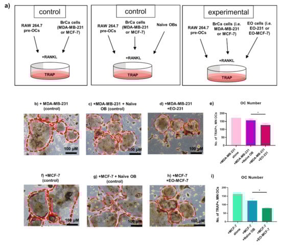 To assess for alterations in osteoclast formation, RAW 264.7 pre-osteoclasts were tri-cultured with A) MDA-MB-231 human triple negative breast cancer cells (i) plus naïve osteoblasts (control) or (ii) plus EO-231 cells; or with B) MCF-7 human ER+ breast cancer cells (i) plus naïve osteoblasts (control) or (ii) plus EO-MCF-7 cells all in the presence of exogenous RANKL for six days (Figure 4a). As additional controls, RAW 264.7 pre-osteoclasts were co-cultured in the presence of exogenous RANKL with (i) MDA-MB-231 human triple negative breast cancer cells alone or (ii) MCF-7 human ER+ breast cancer cells alone (Figure 4a). We specifically chose breast cancer cell subtypes that are most representative of human disease, i.e., triple-negative (MDA-MB-231) and ER+ (MCF-7). After six days, all cultures were subjected to TRAP stain and imaged (Figure 4b–d,f–h). The number of TRAP-positive, multinucleated (≥3 nuclei) osteoclasts were quantified per condition (Figure 4e,i).