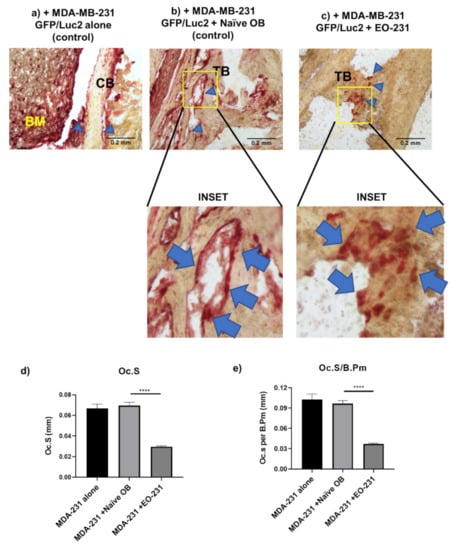 MDA-MB-231GFP/Luc2 cells, MC3T3-E1 naïve OBs, and EO 231 cells were grown to 70–80% confluency. Cells were individually collected and resuspended in 1X PBS (HyClone). MDA-MB-231GFP/Luc2 cells were admixed with MC3T3-E1 naïve OBs or EO 231 cells at a 2:1 ratio, respectively, whereby a total of 5 × 105 cells total in 10 μL PBS were injected into the tibiae of female athymic mice aged 5–6 weeks (Harlan Sprague-Dawley, Indianapolis, IN, USA). MDA-MB-231 GFP/Luc2 cells inoculated alone served as controls (5 × 105 cells in 10 μL PBS). Briefly, mice were anesthetized via an intraperitoneal injection of a mixture of ketamine (129 mg/kg) and xylazine (4 mg/kg). Once the mice were fully anesthetized as evidenced by a toe pinch and lack of movement, for intratibial injections, the hind leg was bent to a 90° position and 27-gauge needle with cells inserted through the patellar tendon and into the proximal tibia using gentle pressure and twisting motion []. At least four mice were utilized per experimental group. IVIS Imaging (Perkin Elmer, Waltham, MA, USA) was used to monitor tumor formation for luciferase expression. Mice were maintained under the guidelines of the NIH and Thomas Jefferson University. All protocols were approved and monitored by the Institutional Animal Care and Use Committee.