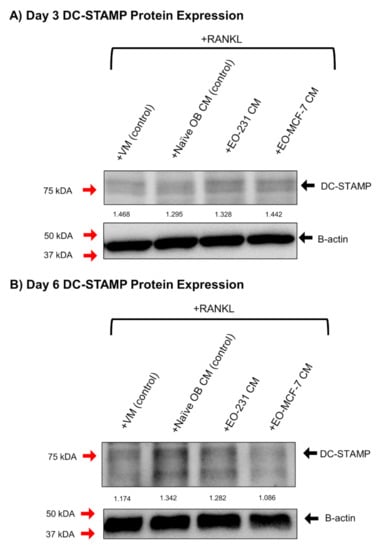 Cells were lysed in ice-cold RIPA lysis buffer containing 20 mM Tris-HCl (pH 7.4, Sigma), 1% NP-40 (v/v, Thermo Fisher Scientific), 0.25% Na-deoxycholate (v/v, Sigma), 150 mM NaCl (Sigma), 1 mM EDTA (Sigma), 1 mM PMSF (Sigma), 1 mM Na3VO4 (Sigma), and 1 mM NaF (Sigma) plus Halt™ Protease and Phosphatase Inhibitor Cocktail (Thermo Scientific), then gently agitated for 1–2 h at 4 °C. Lysates were centrifuged for 20 min at 14,000 rpm at 4 °C, quantified using DC™ Protein Assay (Bio-Rad, Hercules, CA), and boiled with loading buffer for 12 min at 95 °C. Proteins were loaded onto a 12% SDS-PAGE gel (Bio-Rad) and separated by running at 100 V for 1 h 30 min. Separated proteins were transferred to 0.45 µm PVDF membranes (Millipore Sigma, Billerica, MA, USA) and blocked for 1 h using SuperBlock Blocking buffer (Thermo Fisher Scientific) or 5% milk in 0.5% TBS/Tween. Membranes were then incubated with primary antibody (monoclonal mouse anti-DC-STAMP (0.5 ug/mL in superblock; Millipore Sigma) or monoclonal mouse anti-β-actin (1:5000 in 5% milk; Sigma)) overnight at 4 °C. Blots were washed in 0.5% TBS/Tween for 1 h, and a secondary antibody goat anti-mouse HRP (1:7500 for DC-STAMP in superblock or 1:5000 for β-actin in 5% milk; Cell Signaling Technology, Danvers, MA, USA) was used. Blots were then washed with 0.5% TBS/Tween for 1 h. Signals were detected using SuperSignal™ West Femto Chemiluminescent Substrate detection kit (Thermo Scientific) and imaged using the Bio-Rad ChemiDoc™ MP Imaging System (Bio-Rad, Hercules, CA, USA). Band densitometry was calculated using ImageJ software.