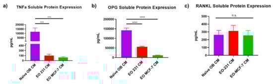 EO-231, EO-MCF-7 CM, and naïve OB CM were subjected to sandwich enzyme-linked immunosorbent assay (ELISA) for soluble protein expression of osteoclast-associated factors receptor activator of nuclear factor kappa-B ligand (RANKL), osteoprotegerin (OPG), and tumor necrosis factor alpha (TNFα). All antibodies and protein standards were purchased from R&D Systems (Minneapolis, MN, USA).