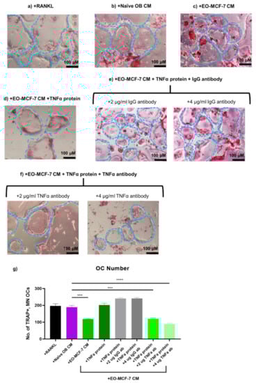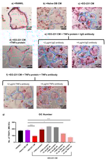 1 × 104 RAW 264.7 cells were differentiated with 50 ng/mL soluble RANKL in the presence of vehicle media (VM; control), naïve OB CM (control), EO-231 CM, or EO-MCF-7 CM. The treatment formulation consisted of three parts osteoclast differentiation media (αMEM (Gibco), 10% FBS (HyClone), and 100 U/mL penicillin/100 μg/mL streptomycin (Gibco)), plus one-part OB CM, EO-231 CM, or EO-MCF-7 CM in the presence of 50 ng/mL RANKL for six days. Cultures containing EO CM were supplemented with 12 ng/mL recombinant TNFα protein (R&D Systems) plus 2 or 4 μg/mL anti-TNFα (R&D Systems). As an additional control, RAW 264.7 pre-osteoclasts were differentiated with 50 ng/mL soluble RANKL in the presence of EO-231 CM or EO-MCF-7 CM supplemented with 12 ng/mL recombinant TNFα protein (R&D Systems) plus 2 or 4 µg/mL polyclonal IgG antibody (R&D Systems). After six days, wells were fixed with 10% formalin and stained for TRAP. Wells were imaged using light microscopy. The number of TRAP+, multinucleated (≥3 nuclei) osteoclasts were quantified per condition. At least three individual replicates were imaged and quantified per condition.