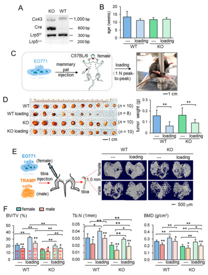 Loading-driven reduction in tumor progression. KO = knockout, and WT = wild-type. The single and double asterisks indicate p < 0.05 and p < 0.01, respectively. (A) Genotyping of wild-type and knockout mice. Cre was driven by the BMP1 promoter, and C x 43 was used as an internal control. The genotypes of a pair of mice (KO and WT) were shown based on amplified PCR products, including floxed Lrp5 (f/f), and Lrp5 (+/+) alleles. (B) Age of the mice used in this study. (C) Procedure for the inoculation of EO771 mammary tumor cells and cyclic knee loading. (D) Images of mammary tumors in four groups (wild-type and knockout with and without knee loading). (E) Micro CT images of the proximal tibiae of the wild-type and knockout mice with and without knee loading. Female mice received EO771 mammary tumor cells, while male mice received transgenic adenocarcinoma of the mouse prostate (TRAMP) prostate tumor cells in their proximal tibia. (F) Three micro CT-linked parameters in the proximal tibiae in the wild-type and knockout mice. BV/TV = bone volume ratio, Tb.N = trabecular number, and BMD = bone mineral density separation.