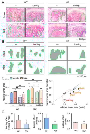 Reduction of the tumor-invaded area by knee loading. KO = knockout, and WT = wild-type. The single and double asterisks indicate p < 0.05 and p < 0.01, respectively. (A,B) H&E-stained histological images of the proximal tibiae of the wild-type and knockout mice with and without knee loading, and the region of the tumor-invaded area. (C) Comparison of the relative tumor area in the proximal tibiae for female and male mice. (D) Comparison of the loading effects on tumor areas between wild-type and knockout mice. The first plot is for all mice, and the second and third plots are for female and male mice, respectively.