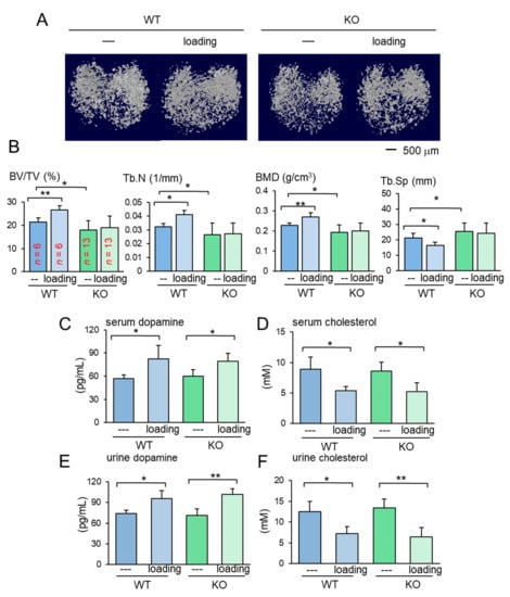 Loading effects on the proximal tibia for the wild-type and knockout mice. KO = knockout, and WT = wild-type. The data are expressed as the mean ± S.D. The single and double asterisks indicate p < 0.05 and 0.01, respectively. (A) Micro CT images of the proximal tibiae of the wild-type and knockout mice with and without knee loading. No tumor inoculation was applied. (B) Four micro CT-linked parameters in the proximal tibiae in the wild-type and knockout mice without tumor inoculation. BV/TV = bone volume ratio, Tb.N = trabecular number, BMD = bone mineral density, and Tb.Sp = trabecular separation. (C,D) Levels of dopamine and cholesterol in the serum in response to tumor inoculation. (E,F) Levels of dopamine and cholesterol in the urine in response to tumor inoculation.