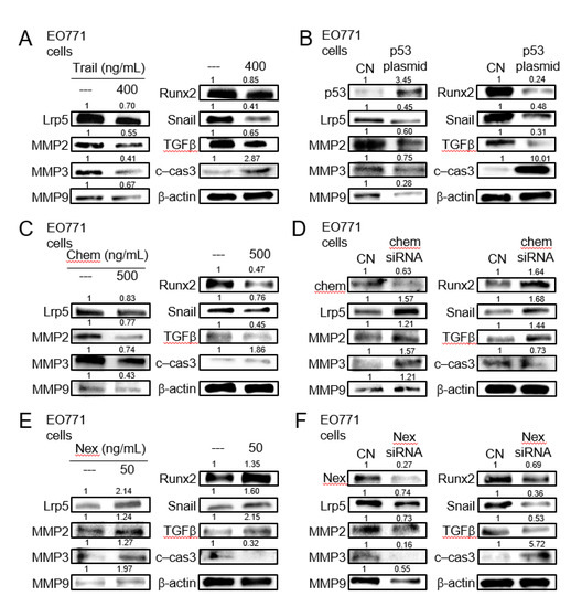 Expression of Lrp5, MMP2, MMP3, MMP9, Runx2, Snail, TGFβ, and cleaved caspase 3 in EO771 mammary tumor cells. CN = control, c-cas 3 = cleaved caspase 3, Chem = chemerin, and Nex = nexin. (A) Response to the administration of TNF-related apoptosis-inducing ligand (TRAIL). (B)Response to the transfection of p53. (C) Response to the administration of chemerin. (D) Response to RNA interference with chemerin siRNA. (E) Response to the administration of nexin. (F) Response to RNA interference with nexin siRNA.