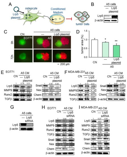 To further evaluate the role of Lrp5 in tumor-osteocyte interactions in vitro, we employed Lrp5 plasmids and siRNA. In a spheroid competition assay, the co-culturing of EO771 tumor spheroids with osteocyte spheroids induced the shrinkage of tumor spheroids. Overexpression of Lrp5 in osteocytes enhanced the shrinkage of tumor spheroids (Figure 6A–D). Lrp5-overexpressing osteocyte-derived conditioned medium (CM) also inhibited EdU-based proliferation and scratch-based migration of MDA-MB-231 breast cancer cells and EO771 mammary tumor cells (Figure S6). Furthermore, Lrp5-overexpressing osteocyte-derived CM downregulated Lrp5, MMP9, Runx2, TGFβ, Snail, and nexin with an increase in chemerin in these cells (Figure 6E,F). Consistently, RNA interference with Lrp5 siRNA reversed the response of these genes (Figure 6G–I).